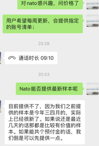 | 2022-07-05 09:55:14 | adpw90 | wxid_7p054rmzkhqf21 | 中午我问过他要最新的样本,他说能不能付个定金,如果最后研判完还是没价值,可以退定金。 |